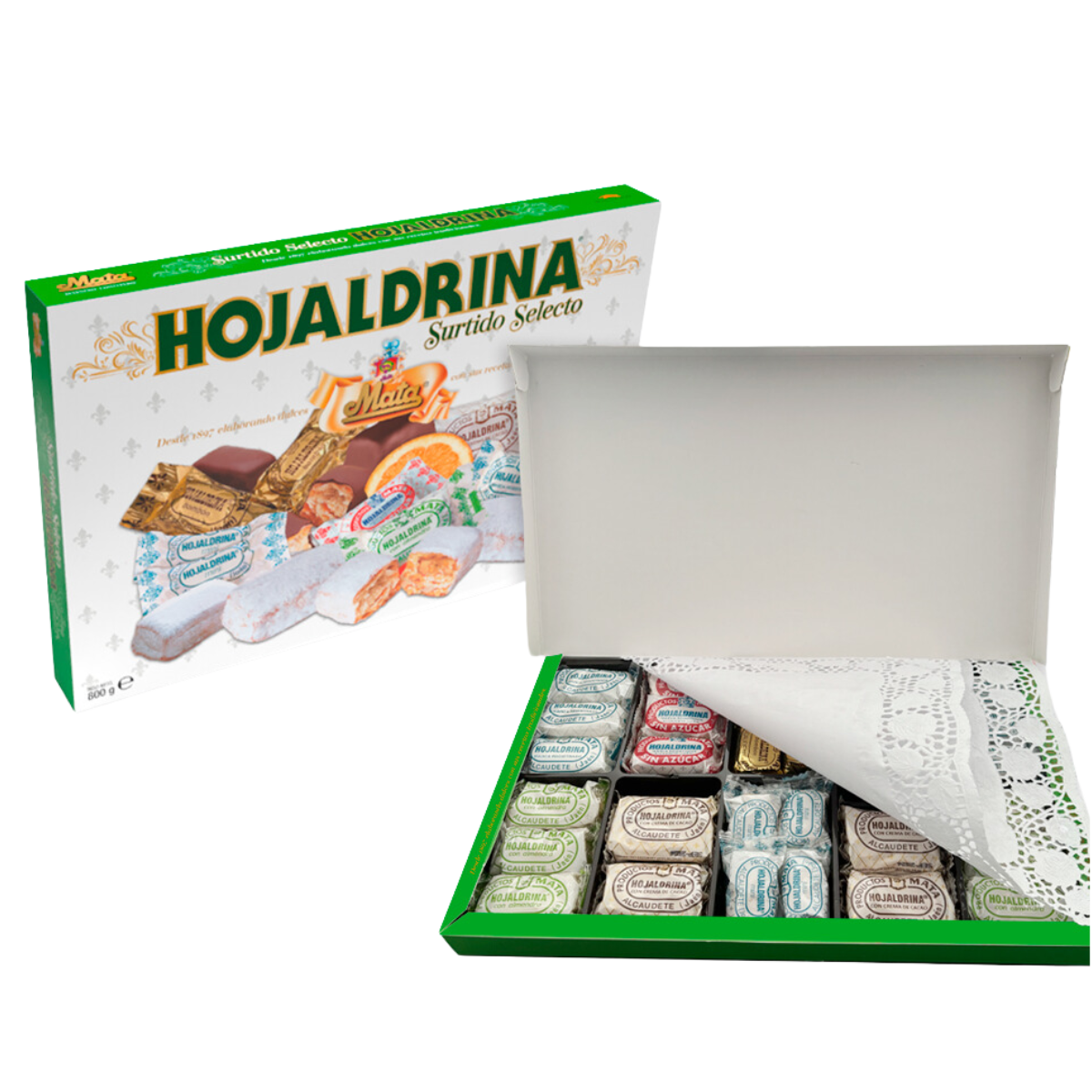 Assortiment sélectionné de Hojaldrinas : classique, version mini, variante au chocolat, garnie de crème de cacao, aux amandes et sans sucre. Ces biscuits croustillants à la texture feuilletée douce sont parfaits pour les moments festifs 800 g