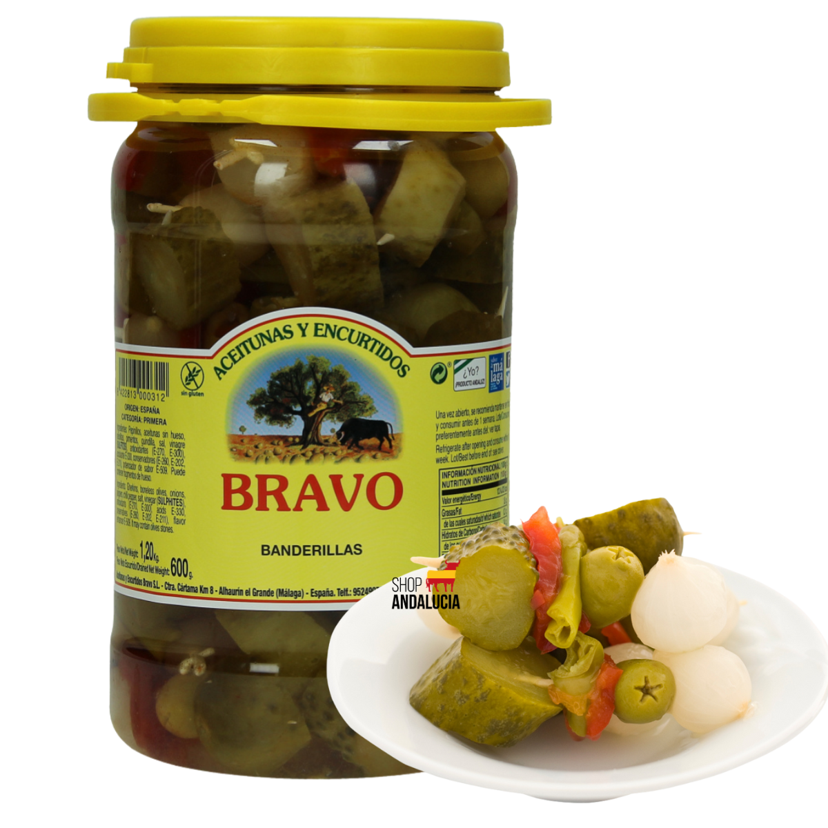 Les Banderillas Picantes Bravo, c’est l’apéritif espagnol par excellence. Sur chaque pique : cornichon, olive verte dénoyautée, petit oignon, poivron rouge et piment guindilla. L’équilibre entre acidité fraîche, touche salée et piquant maîtrisé en fait un incontournable à partager.