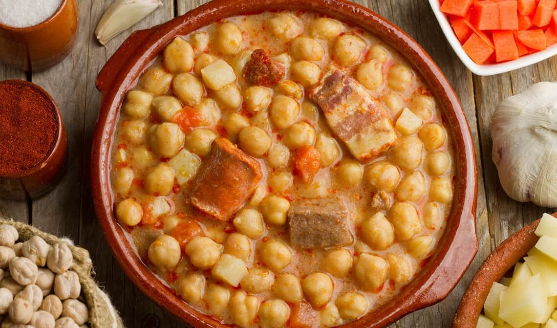 Ingrédients : pois chiches cuits, eau, bœuf, chorizo supplémentaire, lard ibérique, sofrito (tomate, poulet, oignon, purée de pois chiches, poireau, huile de tournesol, ail, poivron), lard fumé, carotte, sel, laurier