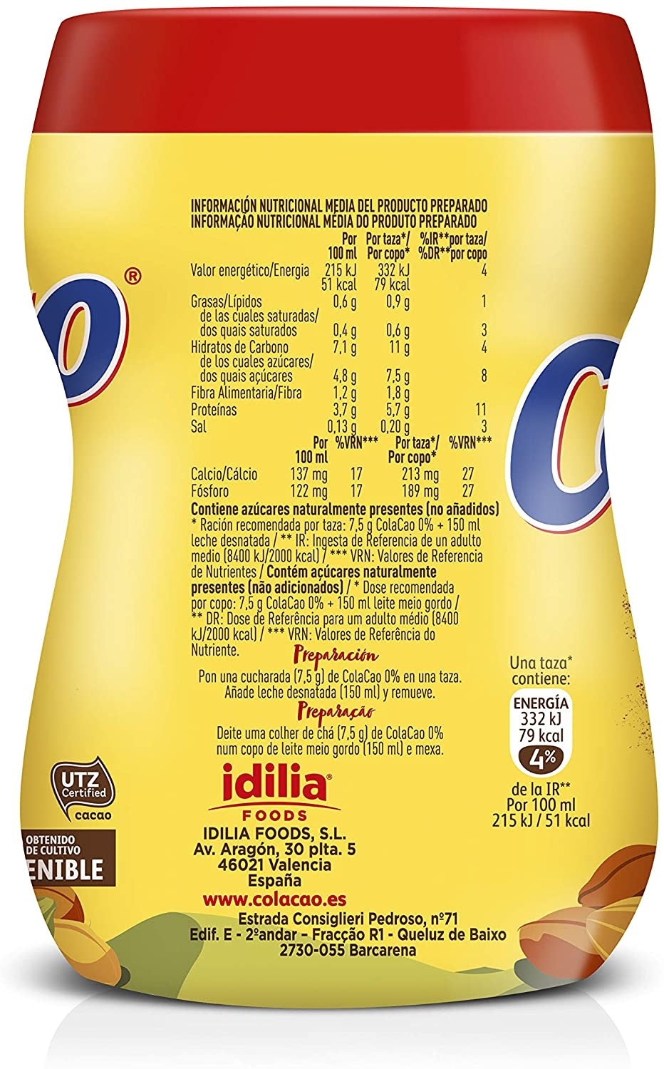 La recette secrète de Cola Cao associe du cacao de haute qualité à des ingrédients soigneusement sélectionnés, ce qui donne une saveur irrésistible et une onctuosité exquise. Que vous appréciiez une tasse chaude de chocolat chaud lors d'une froide journée d'hiver ou que vous l'ajoutiez à des milkshakes pour une touche rafraîchissante, Cola Cao est le compagnon idéal pour des moments de pur plaisir.