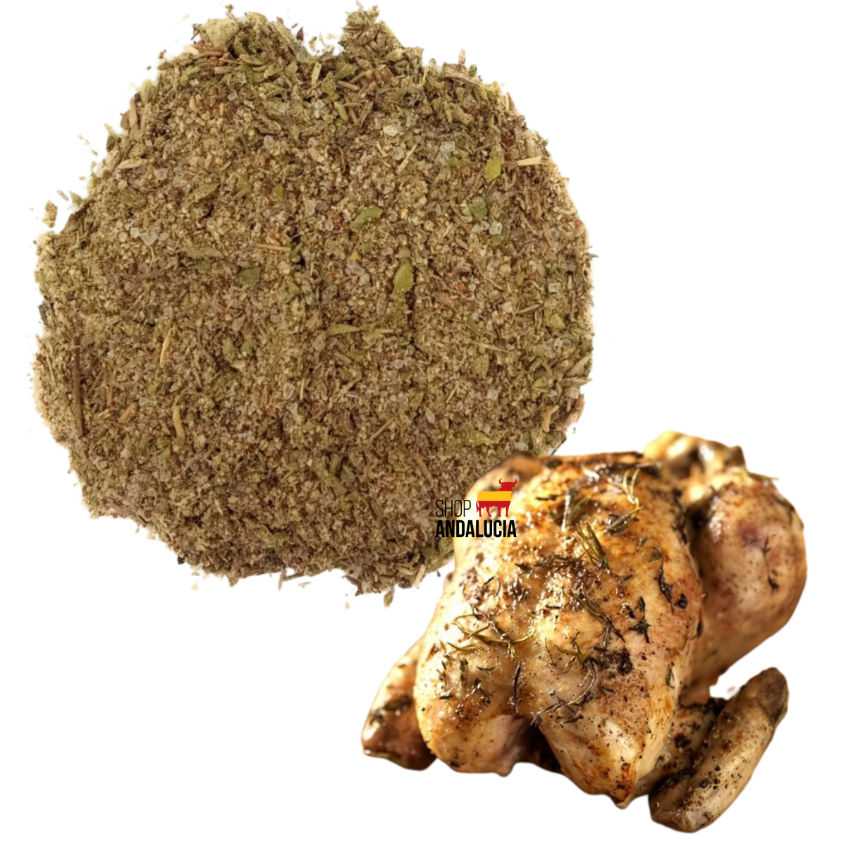 Alliance saline et aromatique d’ail, thym, origan, poivres blanc et noir, cumin et muscade: un profil chaleureux typiquement espagnol qui dore et relève le “pollo a l’ast”.