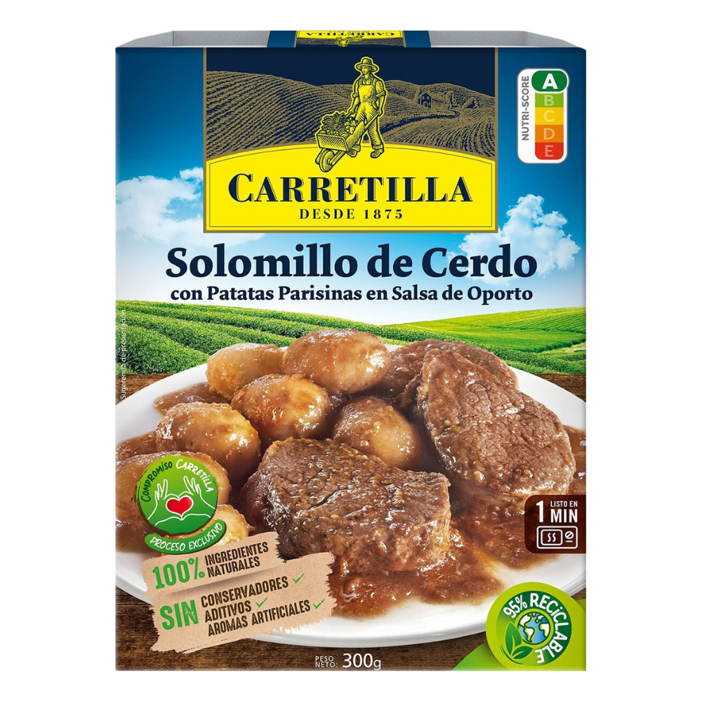 Ingrédients : Filet de porc (35 %), sauce au Porto (33 %), pommes de terre (28 %) et pomme (4 %). Ingrédients de la sauce au Porto : eau, oignon, beurre, Porto (1,8 %), amidon de maïs, ail, concentré de tomates, sel, huile de tournesol, laurier et poivre noir.