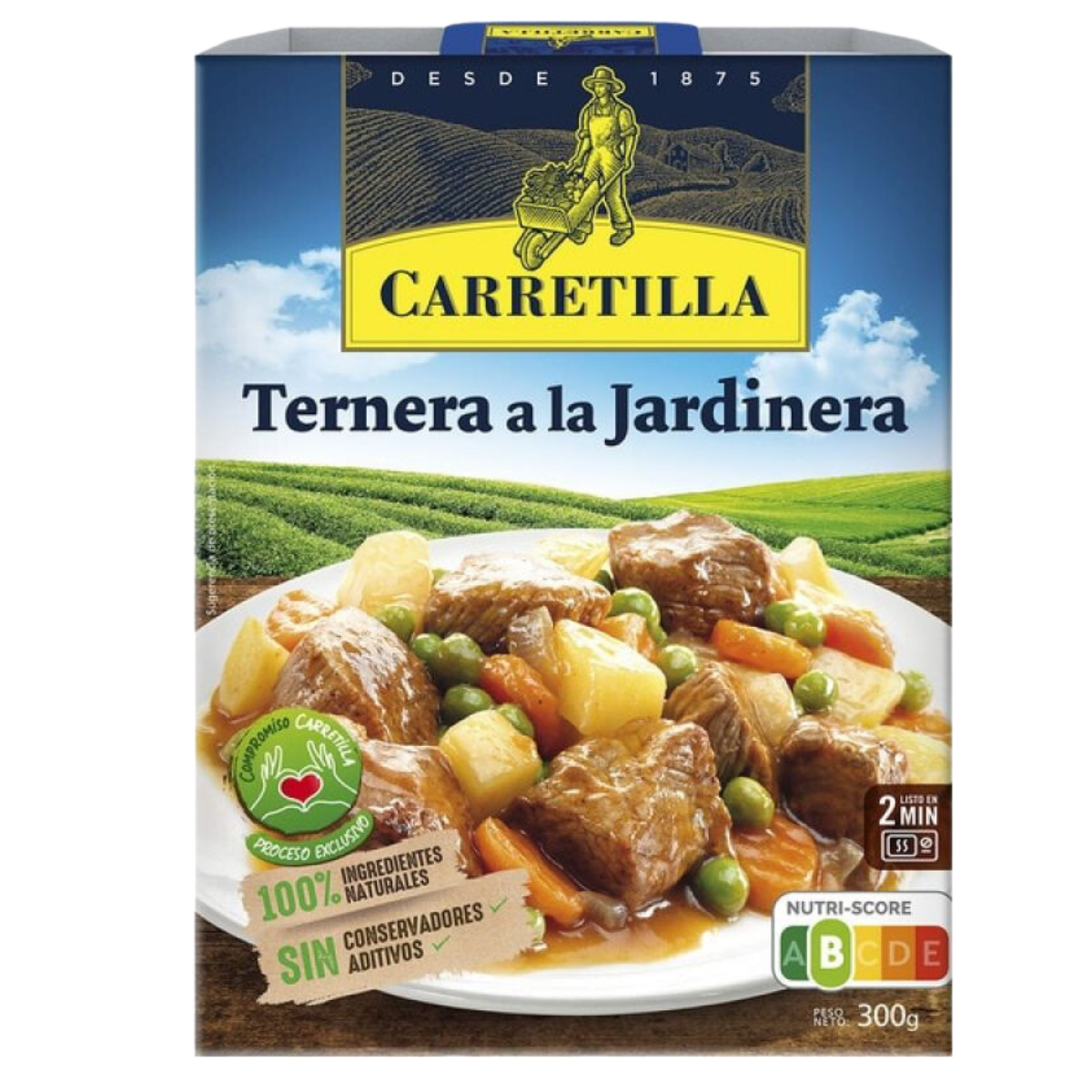 Ingrédients : Viande de veau, légumes [pomme de terre, carotte, petits pois et oignon], purée de tomates, vin rouge, huile d'olive, huile de tournesol, arôme naturel (soja et gluten), amidon de maïs, sel, sucre et épices.