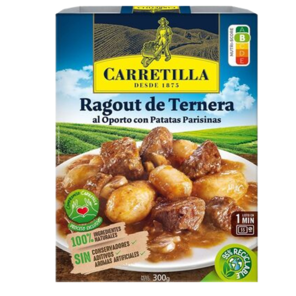 Ingrédients : Bœuf (35%), sauce au porto, pommes de terre (15%), champignons cultivés (Agaricus bisporus) (5%) et pomme (5%).