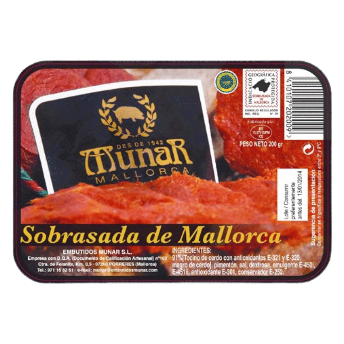 Pâte à tartiner Sobrasada chorizo de Majorque. Cette spécialité espagnole est généralement servie en apéritif ou au petit-déjeuner sur du pain grillé. Elle se marie bien avec des figues, des amandes, du miel et de la confiture. Contenu : 200 g