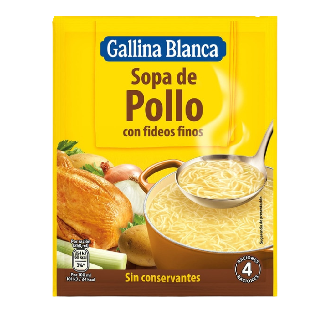Délicieuse soupe instantanée espagnole au poulet, avec un bouillon savoureux et des fideuà. Facile à préparer : ajoutez 1 litre d'eau et faites cuire brièvement. 68 g.