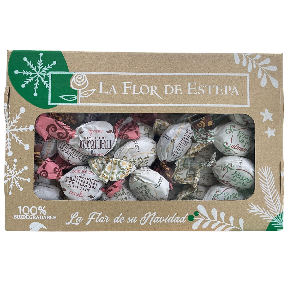 De Caja 3.000 g Surtido Mantecados Sabores “Doble Fleco Seda” bundelt de iconen van Estepa: boterzacht, kruimelig en heerlijk geurig. Van kaneel en citroen tot amandel en sesam — een rijke variatie in textuur en smaak, feestklaar gepresenteerd.