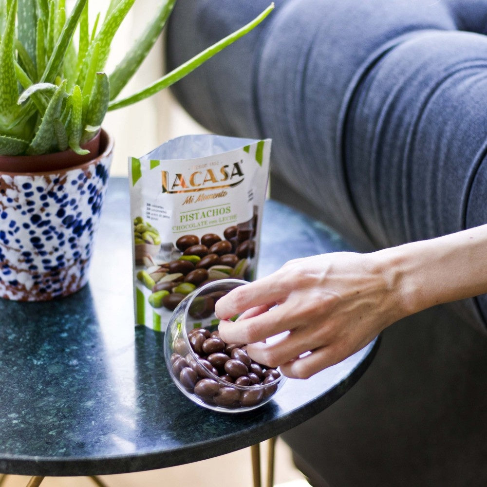 Dit is Spaanse verleiding in snack formaat: 70% melkchocolade om knapperige pistaches, afgewerkt met een subtiele glanslaag. De balans tussen ziltige noot en romige choc maakt ze onweerstaanbaar—een premium snack die moeiteloos van koffiepauze naar cadeaumoment gaat.